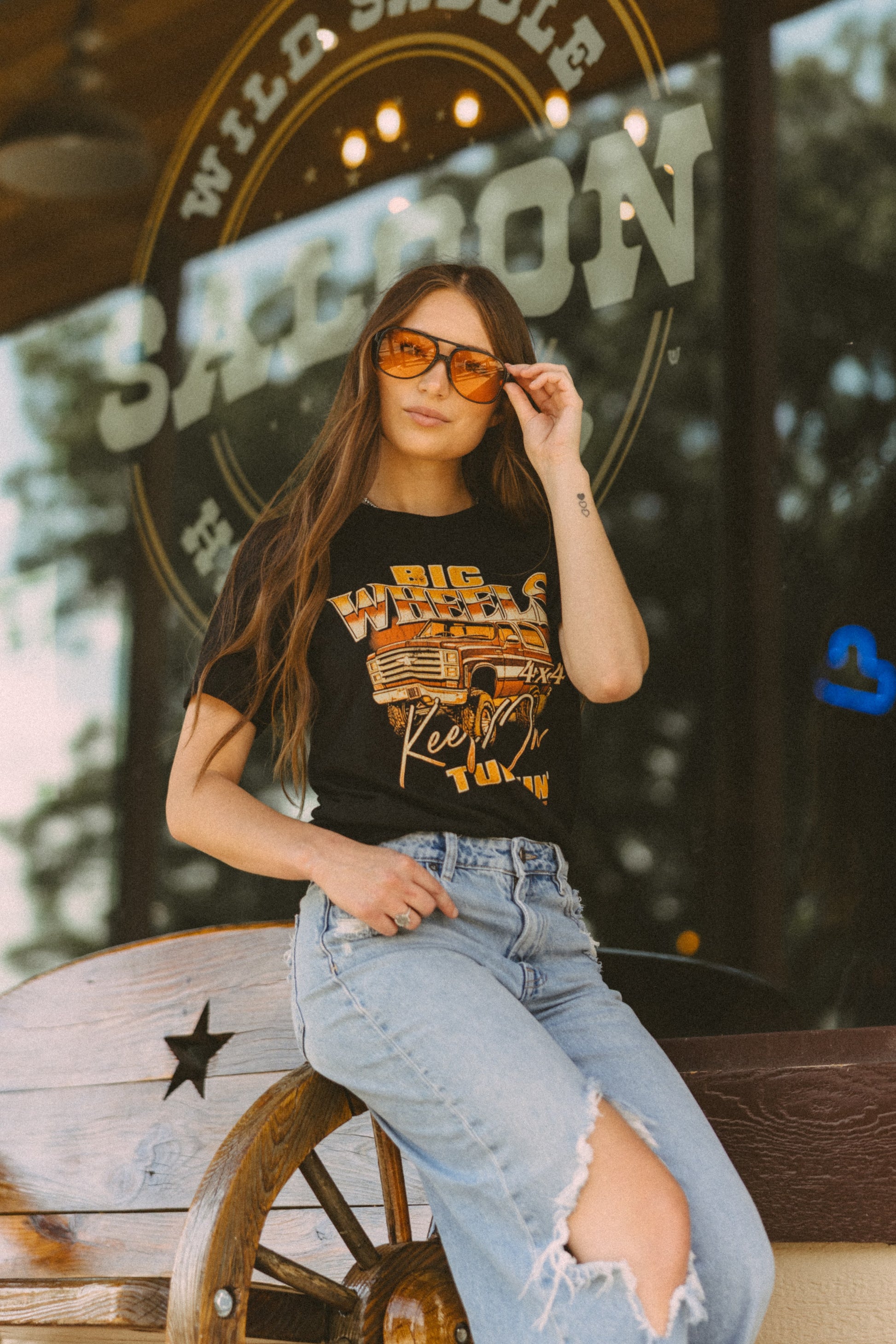 Big Wheels is printed on a Bella+Canvas 3001 Black tee.